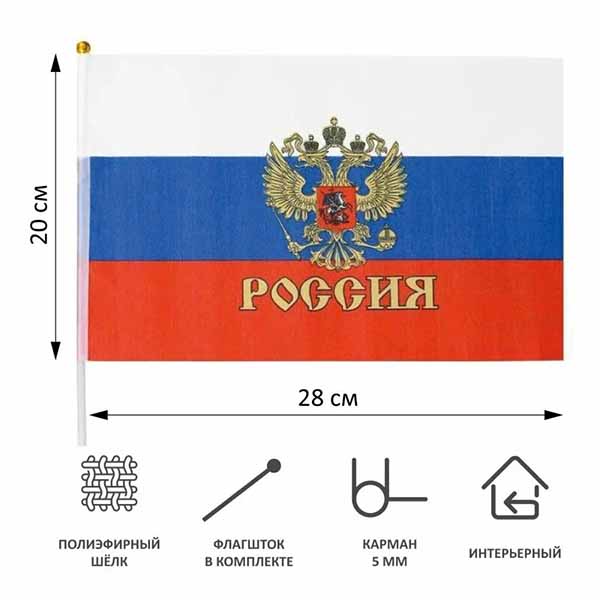 Флаг "России" с гербом на пластиковой трубочке 20х28см.