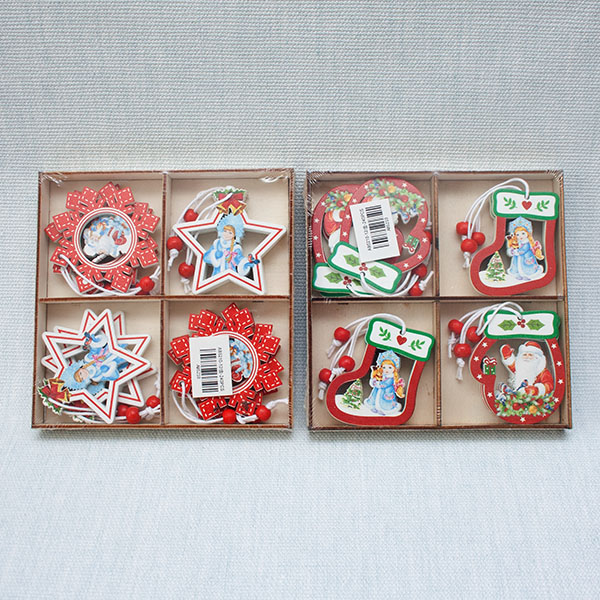 н.г. Набор подвесок новогодних деревянные (12шт.в наборе) "Снежинки, Варежки, Носки" 3вида
