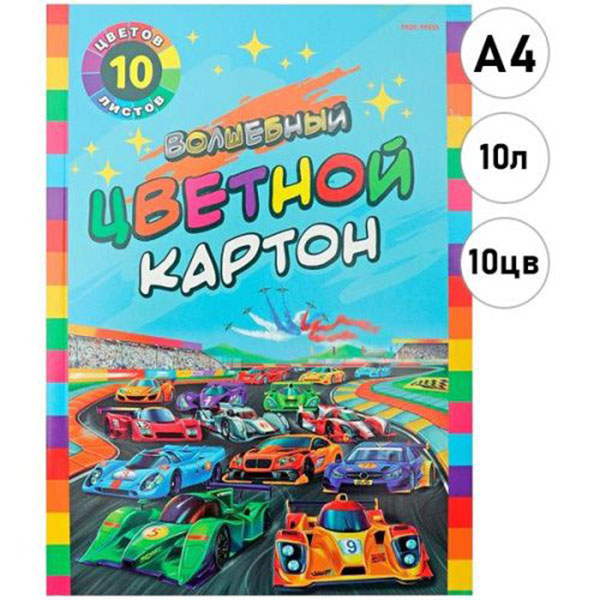 Цветной картон 10л. 10цв. А4 "Яркие автогонки" волшебный (золото+серебро)